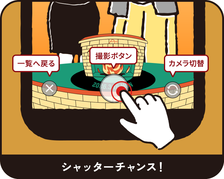 真ん中のボタンで撮影!インカメラへの切り替えもできます。別のフレームに変えたいときは「一覧へ戻る」ボタンをタップ。